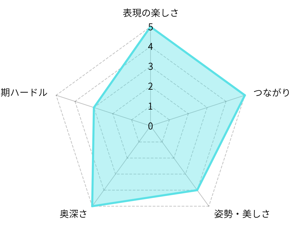 - 踊るために正しい姿勢を取り続けると、猫背が自然に治っていきます。「最近姿勢いいね」と言われる頃には、所作全体が変わっている。外見だけでなく「立ち居振る舞い」が美しくなる趣味です。