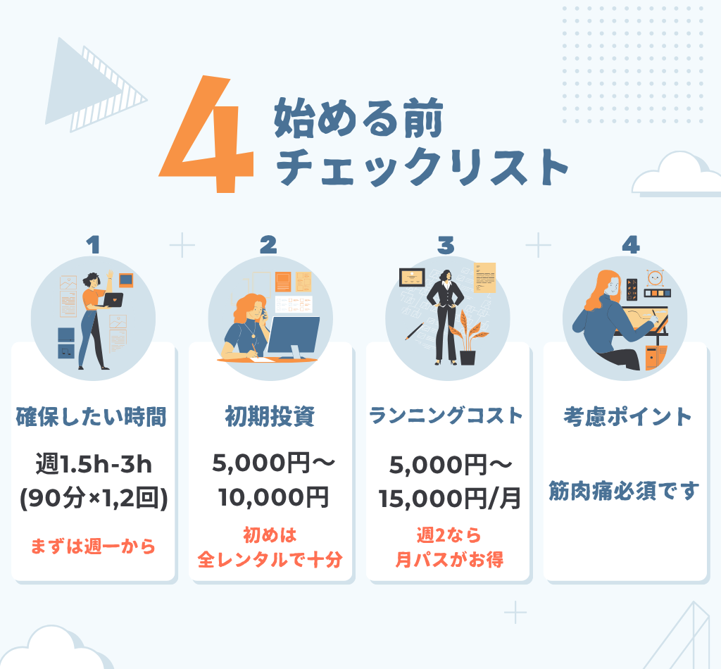 - 月会費や都度利用料はかかるものの、必要な道具は少なく、一度揃えれば長く使えます。