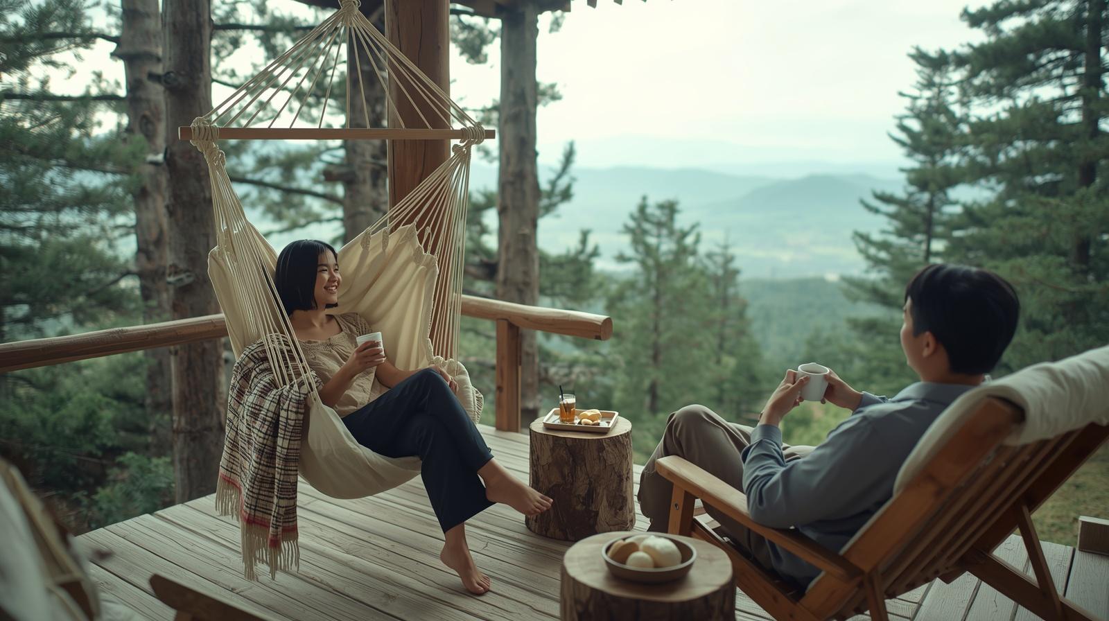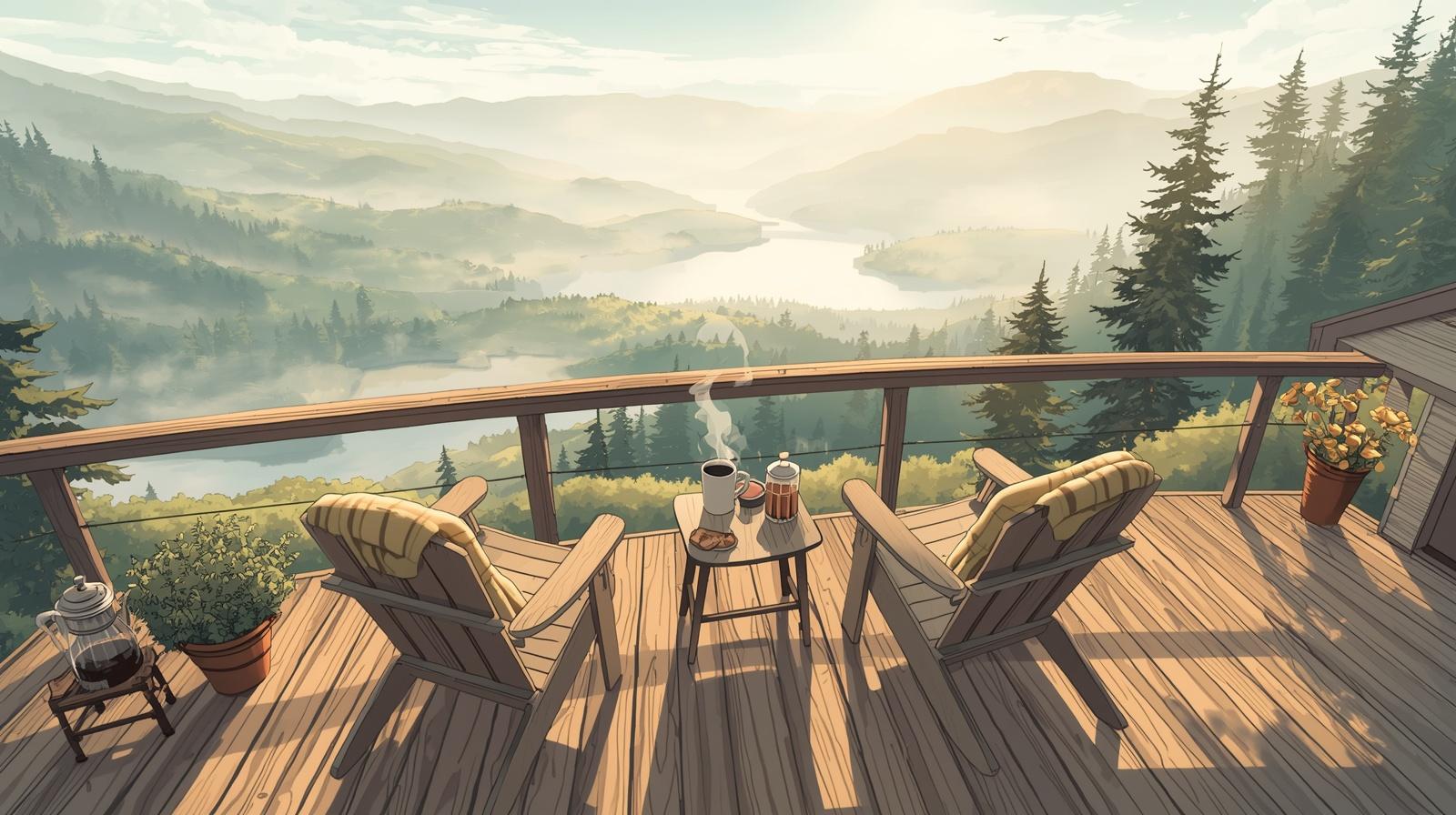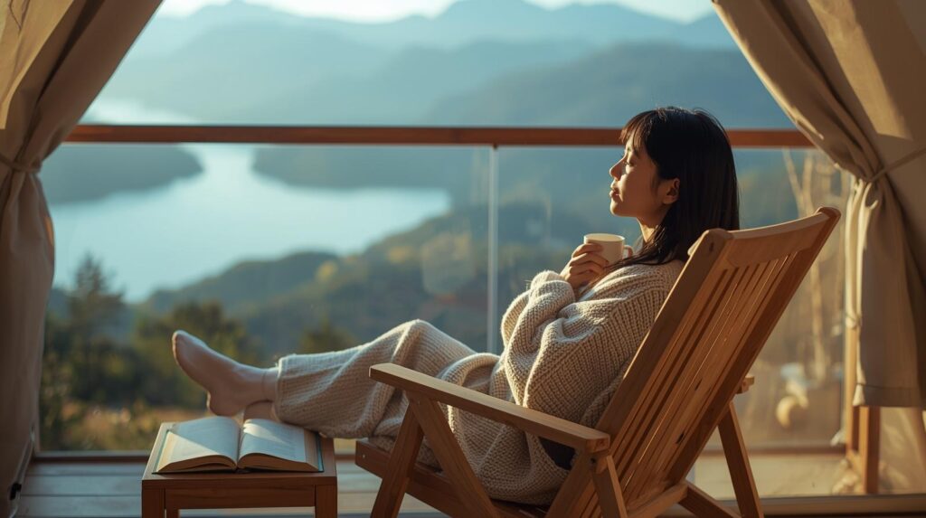 テントの外に出て、深呼吸する。都会にはない、湿った緑の匂いが肺に入ってくる。デッキのチェアに座って、コーヒーを一口。いつもと同じインスタントなのに、なぜかおいしい。