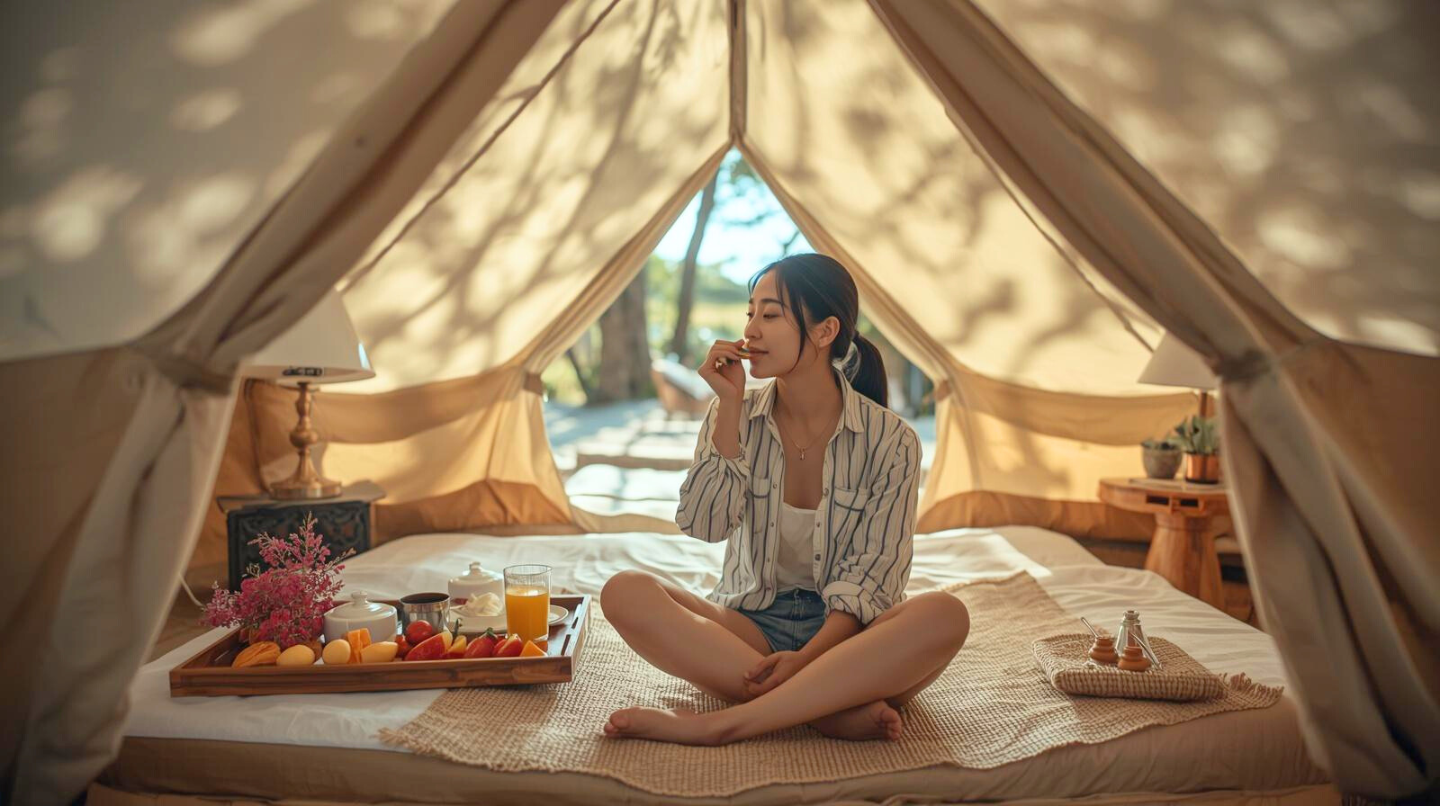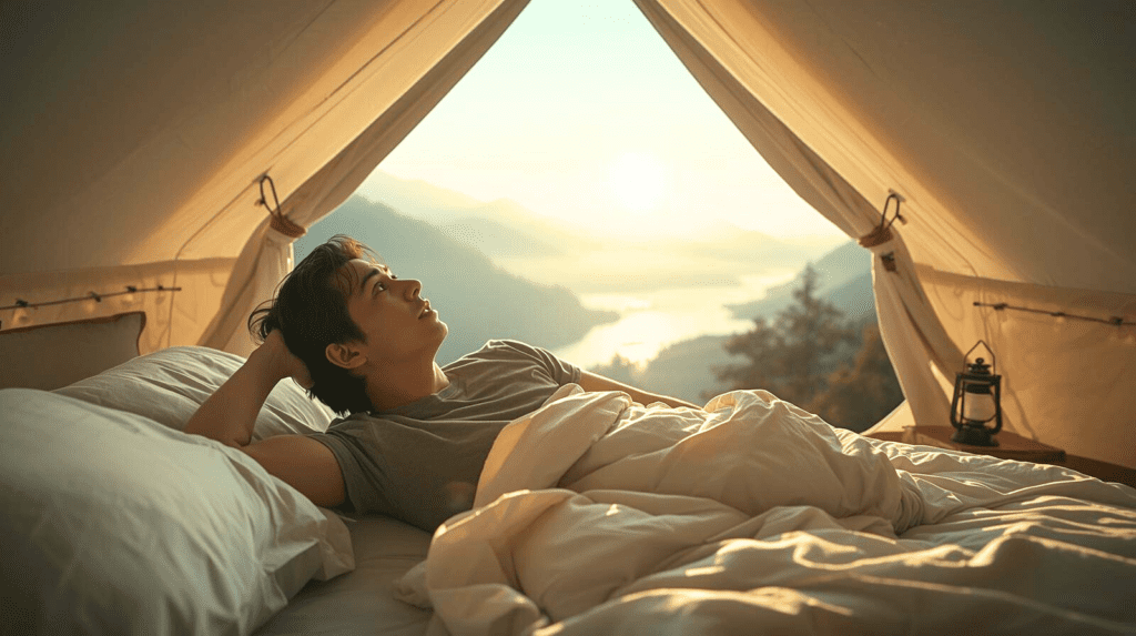 「ここ行ってみたい」。そう思えたら、予約ボタンを押すだけ。テントの中で目が覚めた朝——朝日と、静かな森と、隣で眠るパートナーの寝顔。