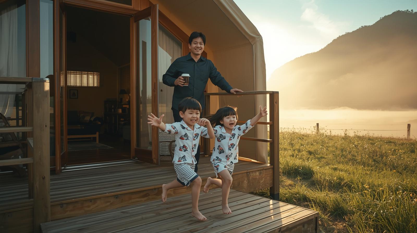 • 子供を自然の中で遊ばせたいけど、キャンプはテント張りながら子供を見れません。グランピングなら着いた瞬間から家族の時間です。BBQはお父さんの見せ所で、子供が初めてマシュマロを焦がして笑う。そういう「初めて」が増えていきます。