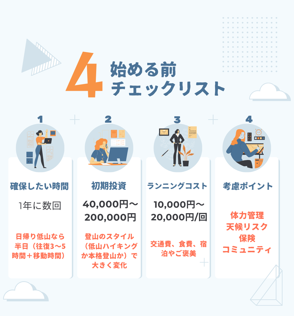- 靴やリュックなど基本装備は必要ですが、レンタルやセールを活用すれば数千円から始められます。まずは最低限で十分です。