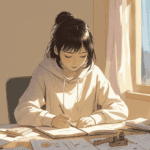普段着で趣味に夢中になっているイラスト。部屋に静かに風が吹き、穏やかな集中が感じられる構図。