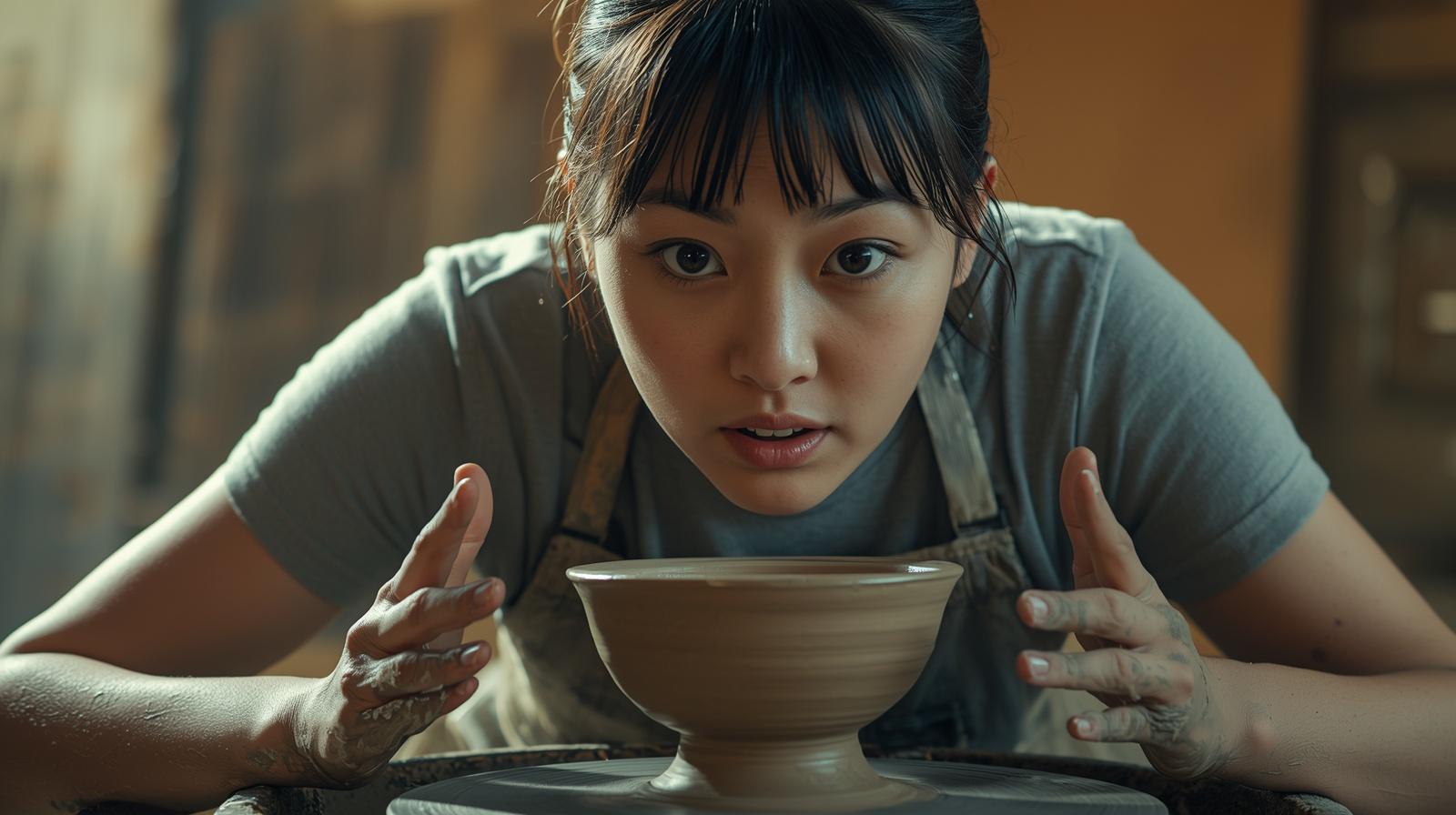 | 14:20 | 手びねりで茶碗の形を作り始める | 指で押すと薄くなり、戻すと厚くなる。思い通りにいかない。でもなぜか夢中になっている。 |