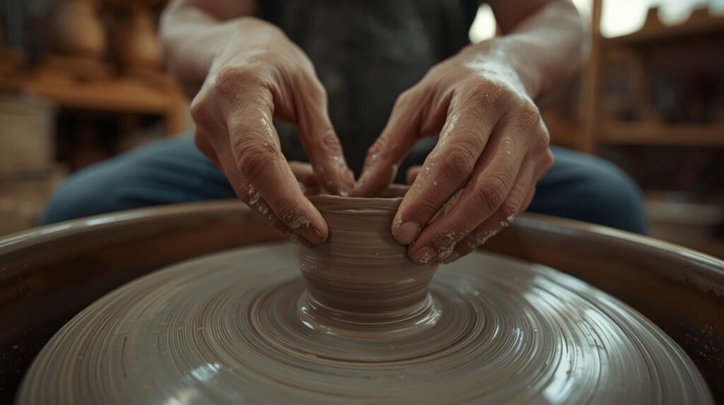 粘土はろくろの回転に合わせて、指先のわずかな圧力で形が変わります。強すぎれば歪み、弱すぎれば広がらない。この繊細な作業の間、脳は「今、ここ」以外を処理できなくなります。